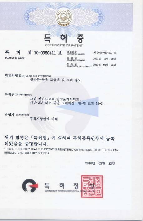 | 27 | 氫氣產生器及其應用 | KR | 10-1133301(2012-03-28) |