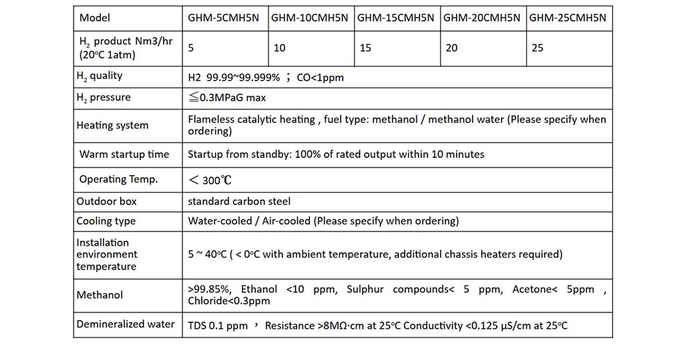 Hydrogen generator (GHM-XXCMH5N series) use methanol as raw material to produce syn-gas, purified by PSA, to produce high-purity hydrogen. The product is widely used in industries such as steel, chemical industry, metal smelting, powder metallurgy, electronics, fuel cells, environmental protection, and new energy.